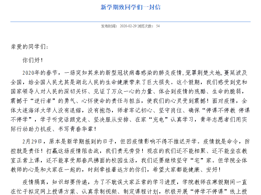 为有序组织疫情期间学院教学工作,保障师生线上课程顺利进行,2月29日,学院党总支向全体师生各致一封信——《老师,请您上好“开学第一课”—致海洋科技与环境学院全体教师的一封信》、《新学期致同学们一封信》,号召全体师生在此“特殊”时期,以饱满的热情投入新学期工作和学习中来,两封信在师生中引起强烈的共鸣和反响,收到良好的动员效果。