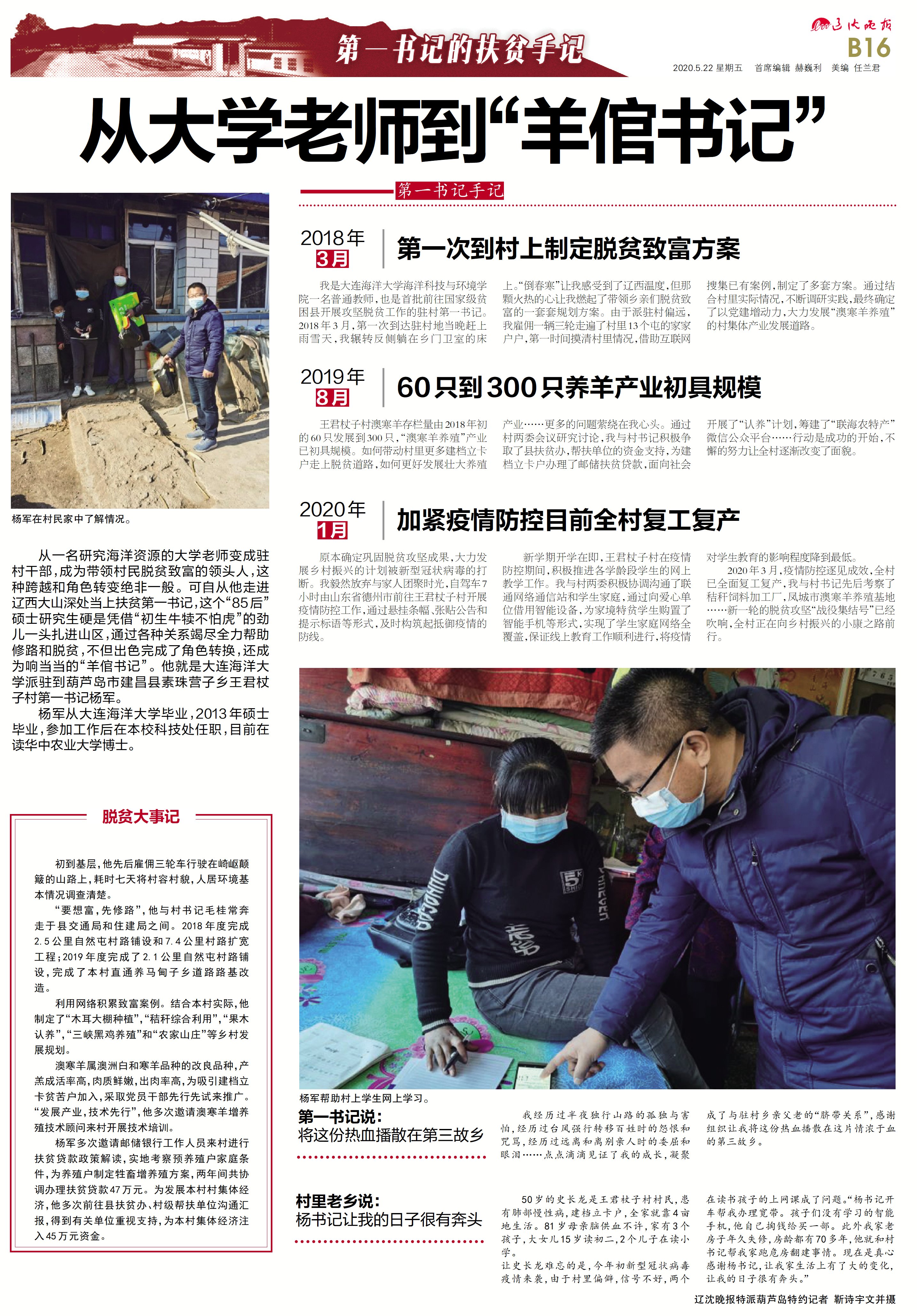 5月22日,2020年全国两会期间,辽沈晚报推出特刊“决战决胜脱贫攻坚,实干苦干辽宁答卷,第一书记的扶贫手记”,以“从大学老师到‘羊倌书记’”为题,整篇幅报道我校海洋科技与环境学院杨军同志脱贫攻坚事迹。辽沈晚报官微同步推出。