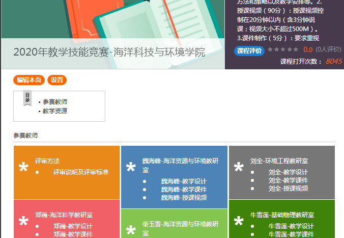 海洋科技与环境学院本次教学技能竞赛首次采用教学视频等材料进行评审。学院将参赛教师的比赛资料放到超星泛亚平台上,学院全体教师进入系统进行查看并通过评分链接给出成绩。为了能够更好的让学院教师参与比赛,学院通过平台发布了一些小活动,比如:签到、投票、问卷、讨论等,让学院全体教师既做技能比赛评审,也是进行学习交流,还是师生角色的转换体验。学院老师将在本次比赛活动中获得全新体验,实现充分的交流讨论,教学技能水平也必将获得进一步提高!