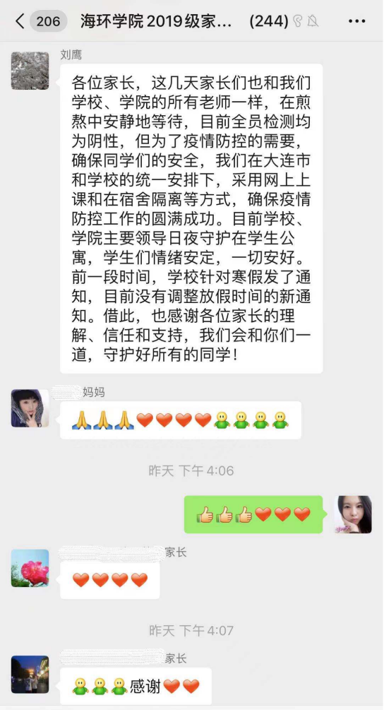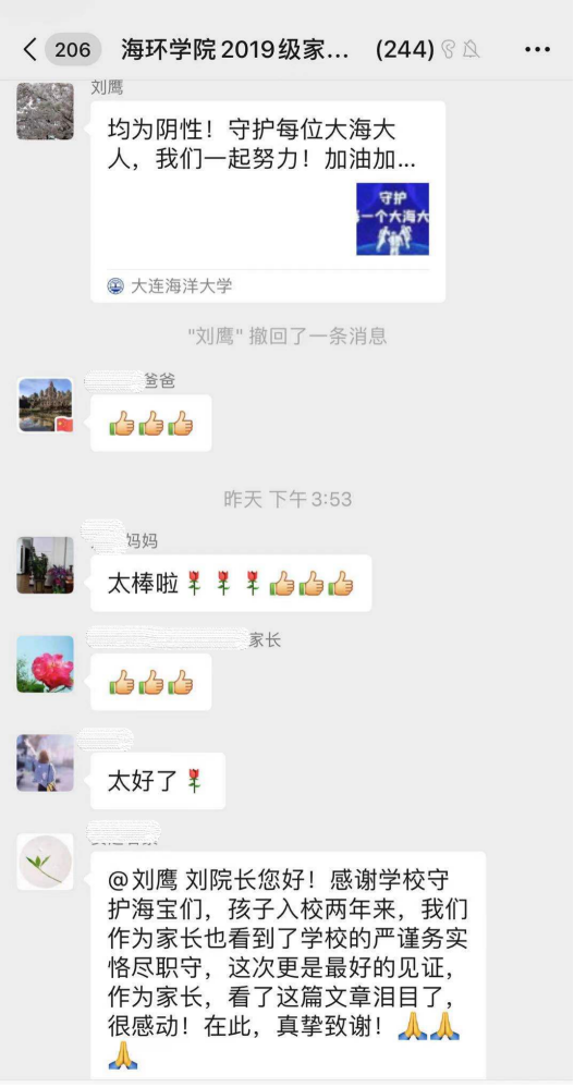 一颗心落地,第一次在校学生全员检测阴性,陪着学生隔离在黄海校区的刘鹰院长第一时间把这个好消息通报给了家长,并许诺一定会守护好所有同学,那一刻家长们紧绷的神经终于可以松缓一些了。