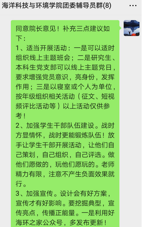 学院领导班子不定时召开线上会议,通报相关工作进展和突发情况处理,大家内外结合,在做好后勤保障,保证线上教学有序进行的过程中,尤其重视特殊时期对学生的爱国主义教育和个人情怀的培养。