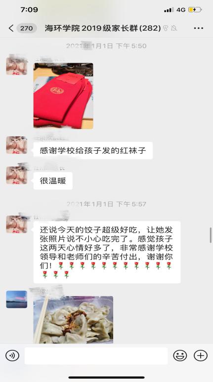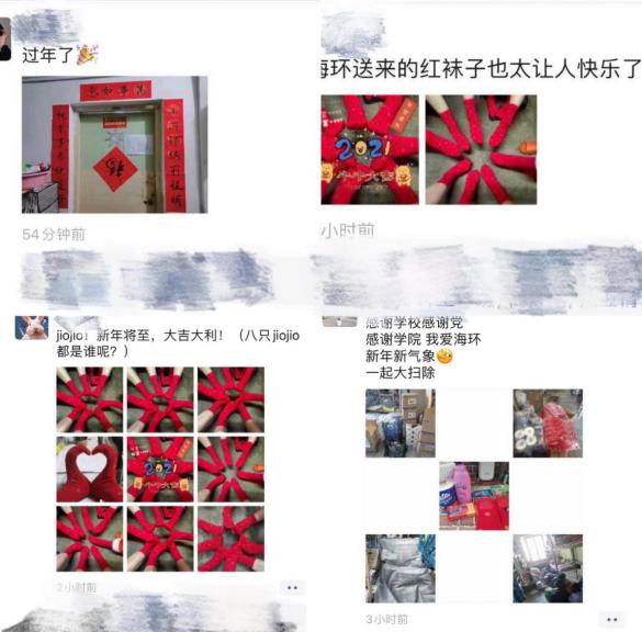 “海环送来的红袜子也太让人快乐了吧”、“感谢学校、感谢党,感谢学院、我爱海环,新年新气象、一起大扫除”,孩子们穿上了红袜子欢乐多多,还不时的摆起了造型,学生家长留言“感谢学校给孩子发的红袜子,很温暖”这一句句的欢声笑语,也让我们大家心里乐开了花。