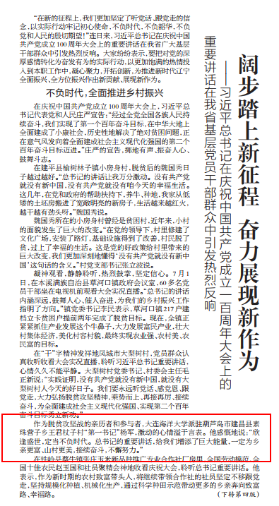 7月4日,《辽宁日报》头版以“阔步踏上新征程 奋力展现新作为——习近平总书记在庆祝中国共产党成立一百周年大会上的重要讲话在我省基层党员干部群众中引发热烈反响”为题,报道了我校派驻建昌县素珠营子乡王君杖子村第一书记杨军同志(海洋科技与环境学院)收看习近平总书记重要讲话的感想。