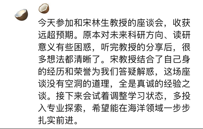 暮色渐染时,活动温情收尾。这场“有咖啡香、有思想碰撞、有情感温度”的对话,既解答了同学们的现实困惑,更点燃了对专业的热爱与责任意识。这份带着对海洋事业热爱的期待,将化作学子们前行的动力,指引他们在未来的征程中坚定方向,越走越远,在海洋领域书写属于自己的精彩篇章。