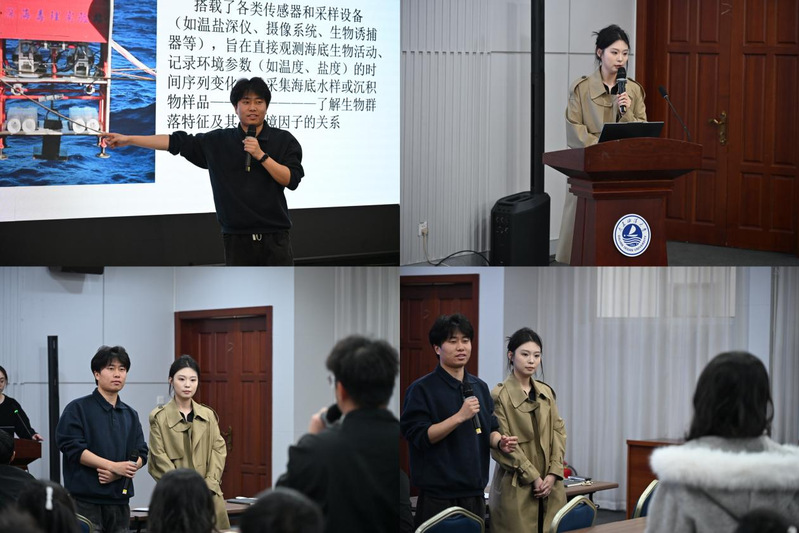 分享环节中,多位参与大洋科考的优秀学子依次登台,结合自身参与的西太平洋、印度洋、东太平洋等不同海域科考任务,分别介绍深海资源勘探、水文调查、环境监测与生态资源调查等工作内容,讲解科考作业流程、关键技术方法与前沿研究方向,分享海上科考实践、技术攻关与船上工作生活的真实经历。