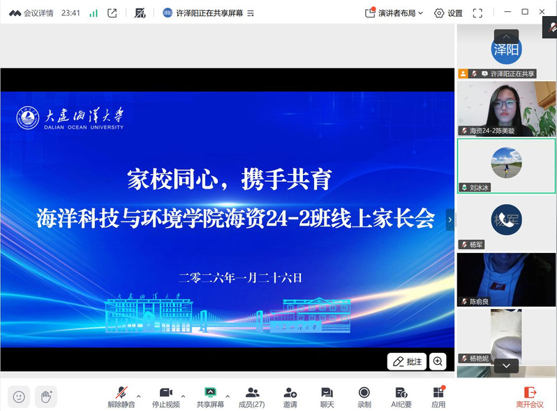 1月26日,我院在腾讯会议召开海洋资源与环境专业24级二班线上家长会。对接班级联系教师校团委负责人刘冰冰...